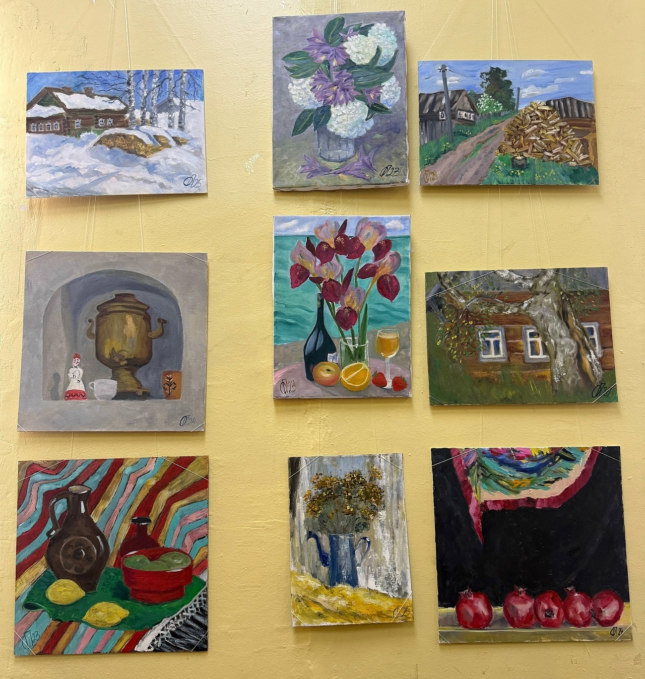 Мероприятие началось с торжественного открытия выставки под поэтичным названием «Калейдоскоп красок». Это уже третья персональная выставка Ольги Николаевны в библиотеке. На этот раз зрителям были представлены живописные работы, созданные художницей за последние три года во время творческих пленэров.